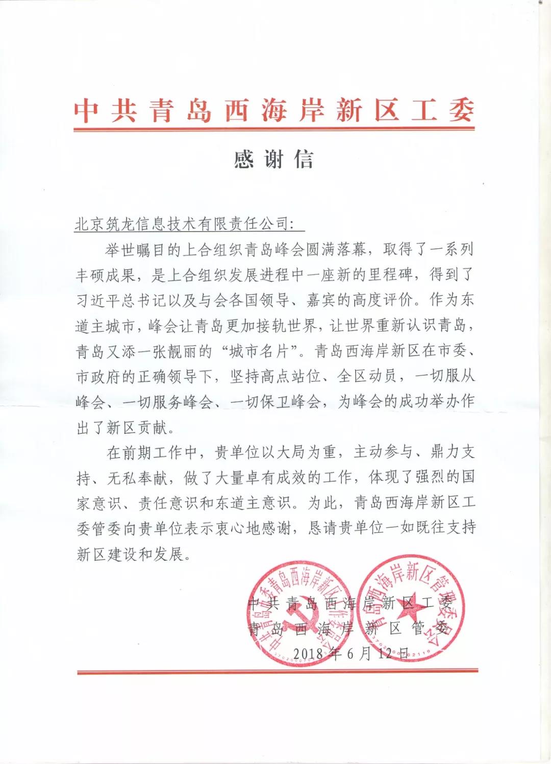 對此,中共青島市委青島西海岸新區工作委員會及青島西海岸新區管理委員會特發來感謝信,表彰筑龍公司在峰會期間所做的大量卓有成效的工作,體現了強烈的國家意識、責任意識和東道主意識。