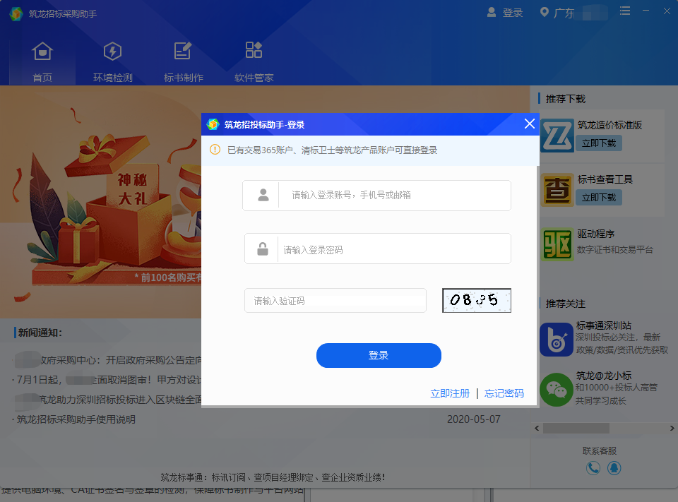 用戶運(yùn)行招標(biāo)采購助手后,可在客戶端右上角點(diǎn)擊【登錄】按鈕進(jìn)行注冊或登錄,界面如下圖1-1所示: