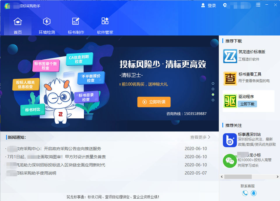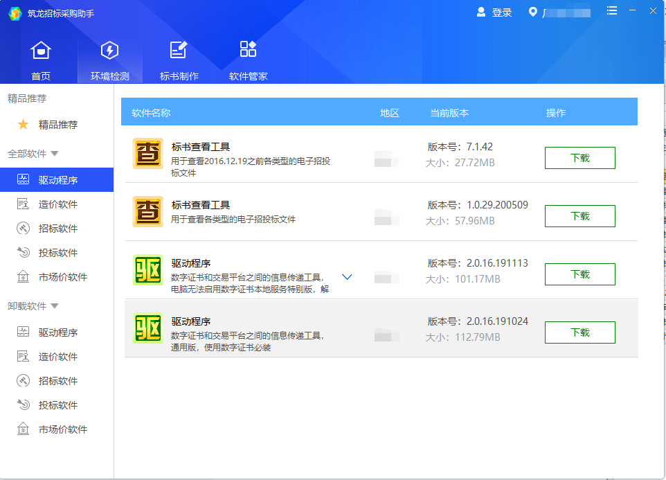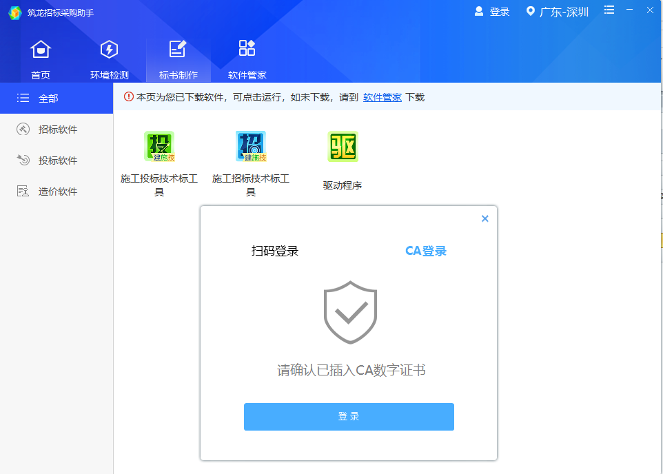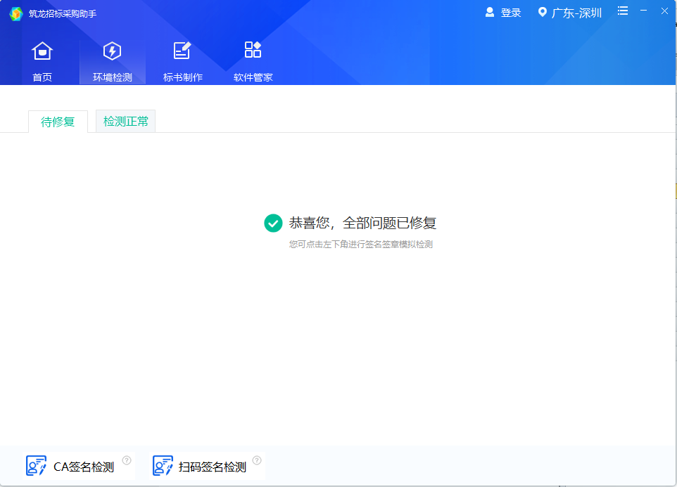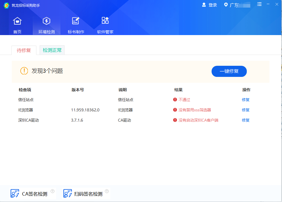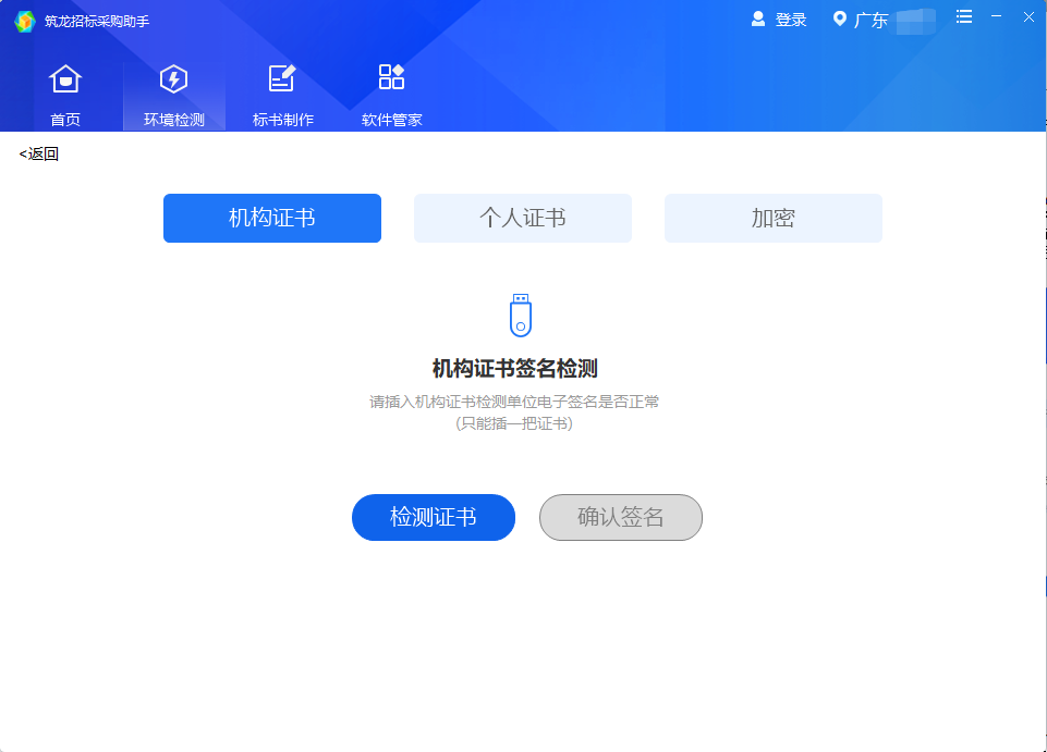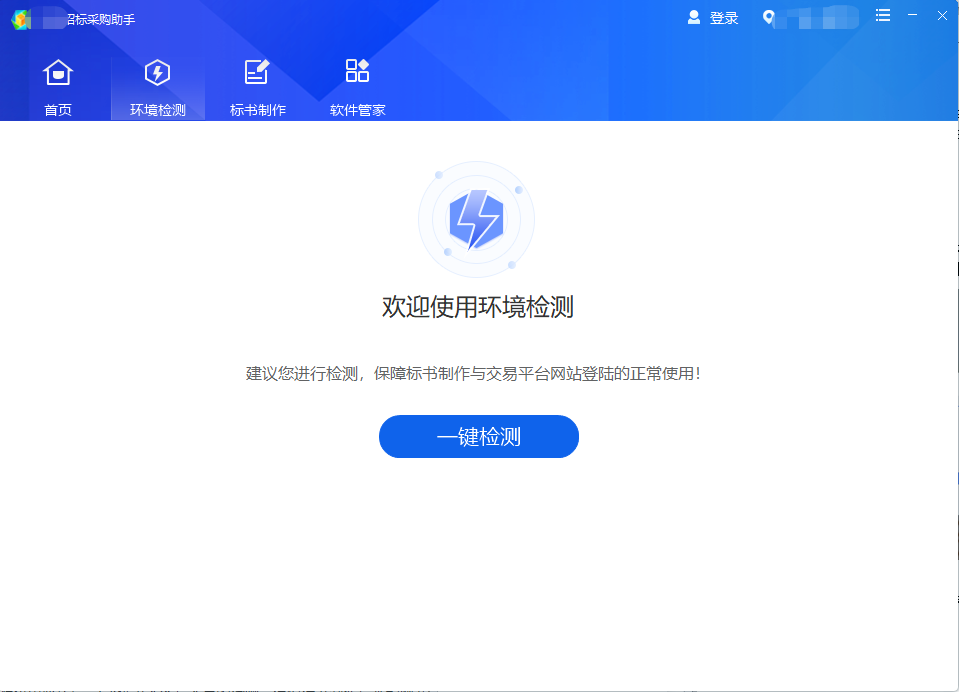提供電腦環(huán)境、CA證書簽名與簽章的檢測與相應(yīng)的驅(qū)動檢測,保障標(biāo)書制作與平臺網(wǎng)站的正常使用。界面如下圖4-1所示: