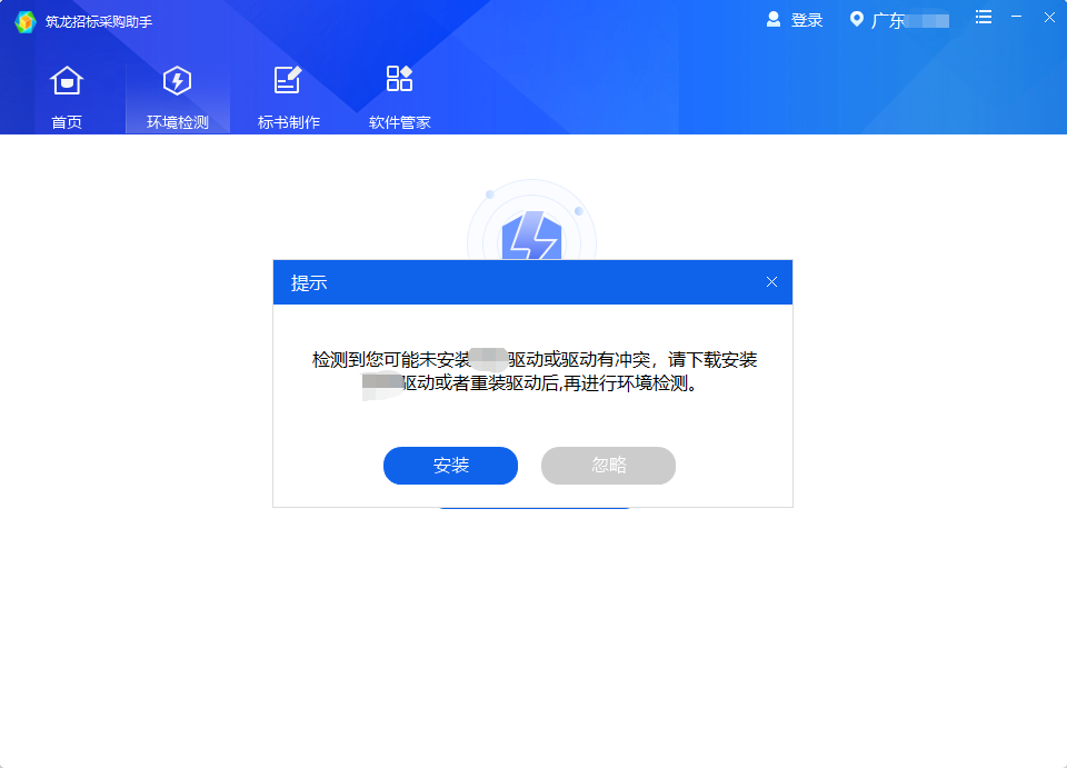一鍵檢測:針對電腦本機(jī)的基礎(chǔ)環(huán)境進(jìn)行檢測,支持一鍵修復(fù)或者對應(yīng)項(xiàng)修復(fù),由于電腦環(huán)境不同,個(gè)別檢測項(xiàng)修復(fù)失敗可能并不影響正常使用,請以實(shí)際情況為準(zhǔn)。對于用戶首次使用該軟件或未安裝所選地區(qū)地區(qū)/企業(yè)的驅(qū)動,點(diǎn)擊【一鍵檢測】將會有驅(qū)動問題的提示,如下圖4-2所示: