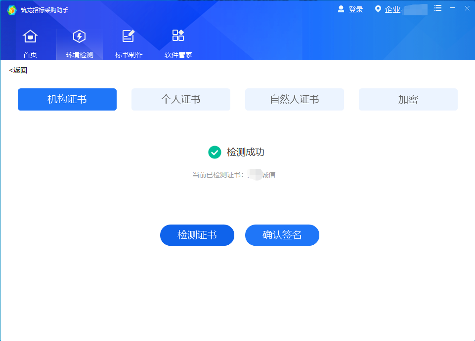用戶可分別選擇機(jī)構(gòu)證書,個(gè)人證書和加密。其中機(jī)構(gòu)證書和個(gè)人證書分別用戶檢測機(jī)構(gòu)和個(gè)人(包括法定代表人,項(xiàng)目經(jīng)理,造價(jià)師)的簽名是否正常。而加密用于檢測證書加密是否正常。請插入對應(yīng)地區(qū)/企業(yè)的證書,然后點(diǎn)擊檢測證書,檢測證書成功界面如下圖4-7所示: