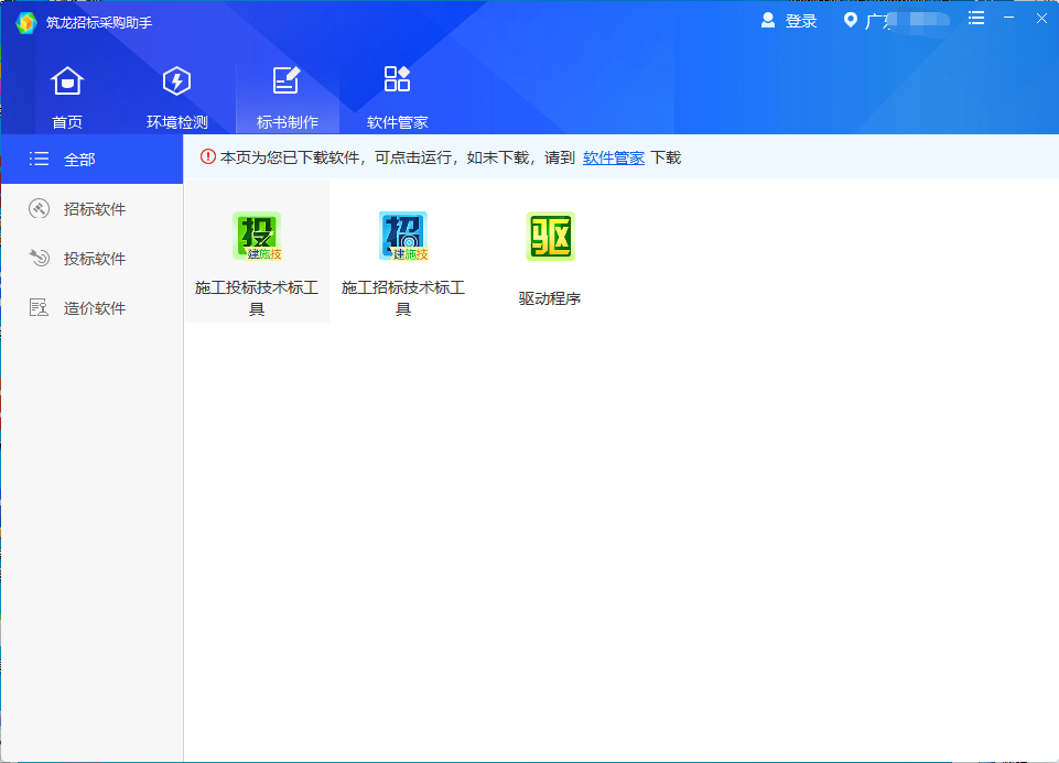 本頁為用戶已下載的軟件,包括招標(biāo)軟件,投標(biāo)軟件和造價(jià)軟件,點(diǎn)擊即可運(yùn)行。如果未下載標(biāo)書制作相關(guān)軟件,請點(diǎn)擊【軟件管家】,選擇所需軟件進(jìn)行下載。已下載的標(biāo)書制作相關(guān)的工具軟件將會分類展示,只需點(diǎn)擊相應(yīng)軟件進(jìn)入即可。界面如下圖5-1所示: